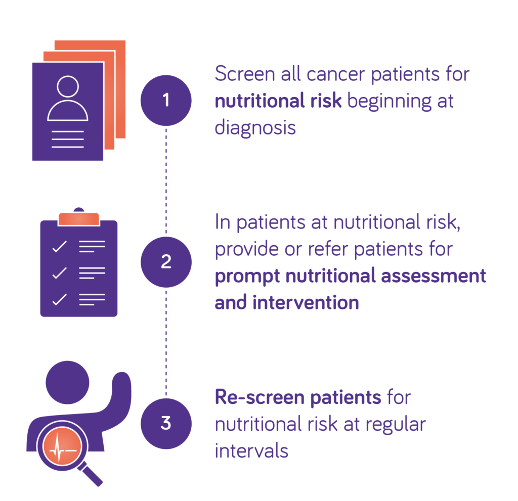 Οι οδηγίες της ESPEN και της ESMO συνιστούν συστηματική ανίχνευση διατροφικού κινδύνου ήδη από τη στιγμή της διάγνωσης για την έγκαιρη ανίχνευση διατροφικών ανισορροπιών σε ασθενείς με καρκίνο.⁶,⁷
