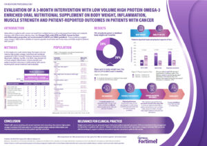 Πρόκειται για μια πολυκεντρική μελέτη παρέμβασης, διάρκειας τριών μηνών, στην οποία συμμετείχαν 776 ογκολογικοί ασθενείς με διαφορετικούς τύπους καρκίνου (π.χ., γαστρεντερικός, μαστού, πνεύμονα, κεφαλής και τραχήλου κ.α.). Οι ασθενείς έλαβαν σκεύασμα ειδικής διατροφής (Fortimel Forticare Sensations 2,4kcal) με υψηλή περιεκτικότητα σε πρωτεΐνη (18g/125ml) και ω-3 λιπαρά οξέα (1,1g EPA, 0,7g DHA/125ml) σε προτεινόμενη δοσολογία 2 μπουκάλια την ημέρα.
